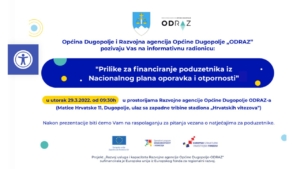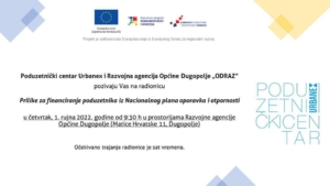 Poduzetnički centar Urbanex i Razvojna agencija Općine Dugopolje „ODRAZ”pozivaju Vas na informativnu radionicu: “Prilike za financiranje poduzetnika iz Nacionalnog plana oporavka i otpornosti” u četvrtak 1.9.2022. od 09:30h u prostorijama Razvojne agencije Općine Dugopolje ODRAZ-a(Matice Hrvatske 11, Dugopolje, ulaz sa zapadne tribine stadiona „Hrvatskih vitezova”) Nakon prezentacije biti ćemo Vam na raspolaganju za pitanja vezana